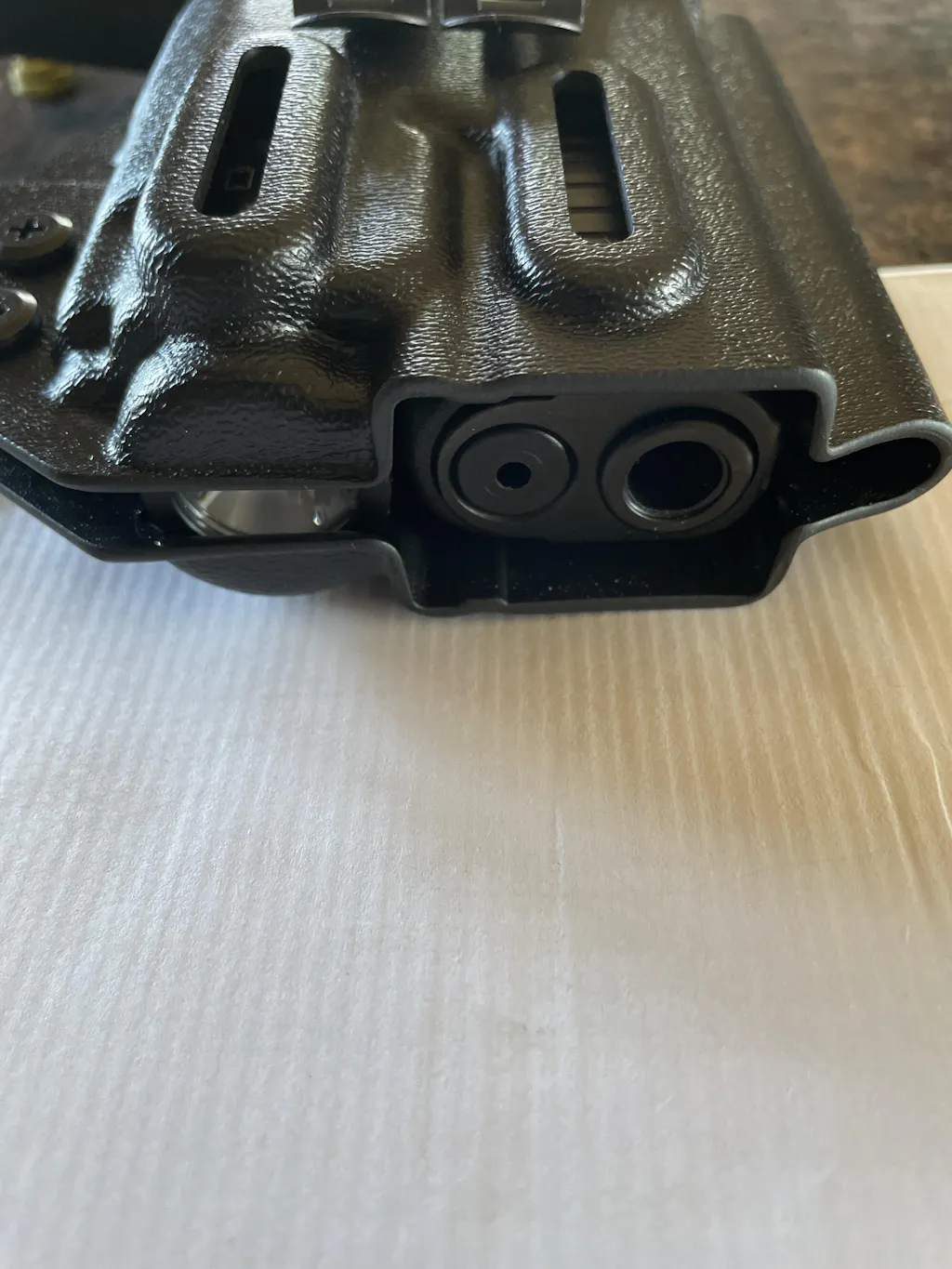 The TLR-XG , I have mounted on my Glock g45 has a laser in with the light . In knowing that I wouldn’t think you would design a holster that would rest the weight of the firearm on the light / laser and jeopardize the accuracy of your weapon . The barrel actually has nothing across the bottom where barrel could rest , thus putting all the weight of the gun on the laser which has holster across the bottom contacting the light/laser jeopardizing knocking it out of adjustment. Reversing the resting point of the firearm would eliminate that .