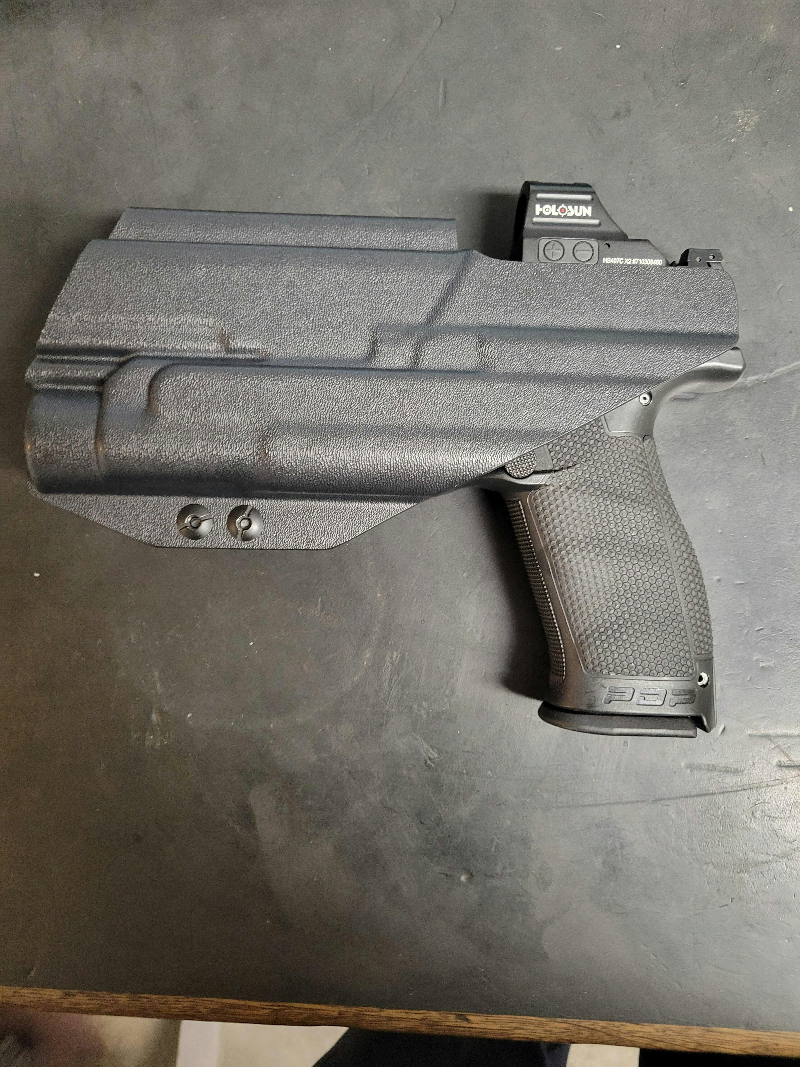 Each holster is formed, trimmed, and folded in-house. Final fit and function tests are done with the actual pistol and light to ensure the holster fits the gun/light combination and has the correct amount of retention.